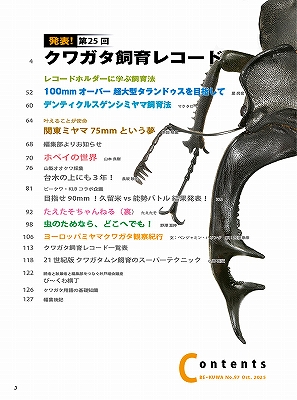 100mmオーバー超大型タランドゥスを目指して / デンティクルスゲンシミヤマ飼育法 / 関東ミヤマ 75mmという夢 / 目指せ 90o! 久留米vs能勢バトル結果発表! / ヨーロッパミヤマクワガタ観察紀行 / 21世紀版 クワガタムシ飼育のスーパーテクニック